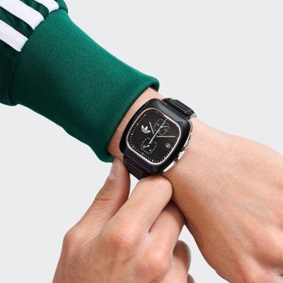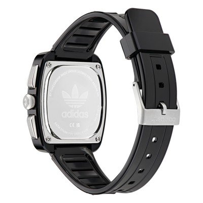 This Adidas watch has a case made of BioCeramic with a diameter of 39 mm and is fitted with a Bio-sourced resin band. Inside the case lies a Timex movement and the watch features a Mineral crystal.