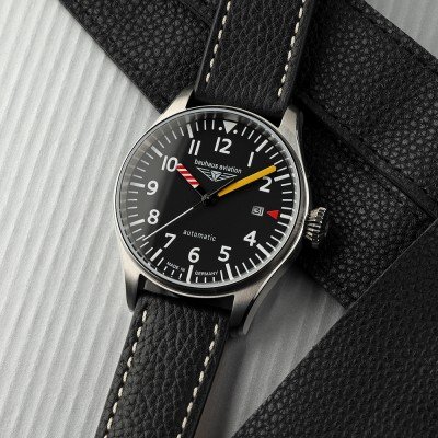This Bauhaus watch has a case made of stainless steel with a diameter of 40 mm and is fitted with a leather band. Inside the case lies a Miyota movement and the watch features a K1 Mineral crystal.