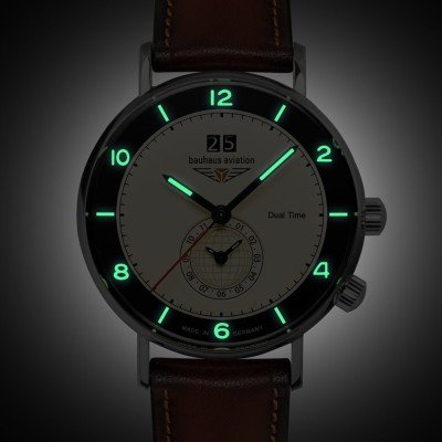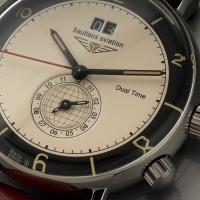 This Bauhaus watch has a case made of stainless steel with a diameter of 41 mm and is fitted with a leather band. Inside the case lies a Ronda movement and the watch features a K1 Mineral crystal.