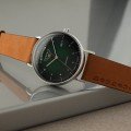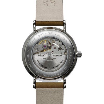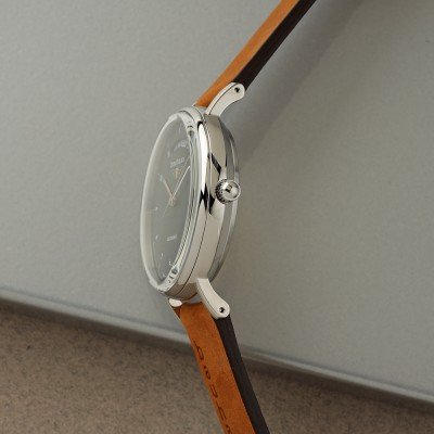 This Bauhaus watch has a case made of stainless steel with a diameter of 41 mm and is fitted with a leather band. Inside the case lies a Miyota movement and the watch features a K1 Mineral crystal.