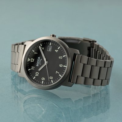 This Boccia watch has a case made of titanium with a diameter of 37 mm and is fitted with a titanium band. Inside the case lies a Miyota movement and the watch features a Mineral crystal.