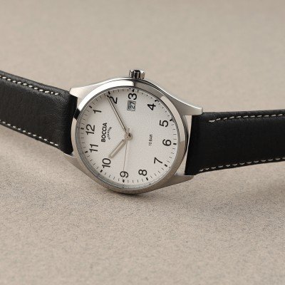 This Boccia watch has a case made of titanium with a diameter of 39 mm and is fitted with a leather band. Inside the case lies a Miyota movement and the watch features a Mineral crystal.