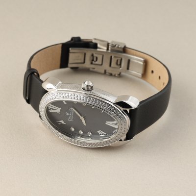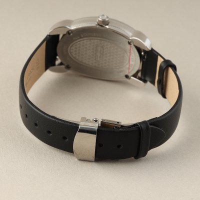 This Charmex of Switzerland watch has a case made of stainless steel with a diameter of 28 mm and is fitted with a Satin Leather band. Inside the case lies a Ronda movement and the watch features a Sapphire crystal.
