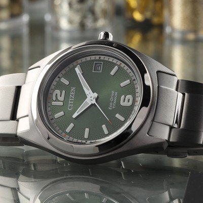 This Citizen watch has a case made of Super Titanium with a diameter of 34 mm and is fitted with a Super Titanium band. Inside the case lies a Citizen movement and the watch features a Mineral crystal.