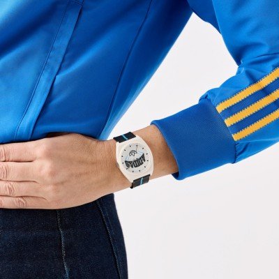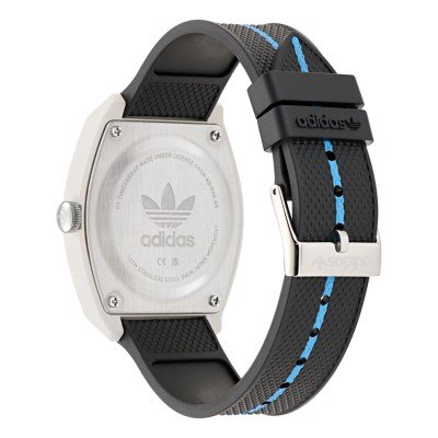 Diese Adidas Uhr hat ein Kunstharz Gehäuse mit einem Durchmesser von 38 mm und ist mit einem Armband aus Kunststoff / Harz versehen. In der Uhr arbeitet ein Timex Uhrwerk. Das Glas der Uhr besteht aus Acryl - Glas.