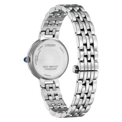 Diese Citizen Uhr hat ein Edelstahl Gehäuse mit einem Durchmesser von 27.7 mm und ist mit einem Armband aus Edelstahl versehen. In der Uhr arbeitet ein Citizen Uhrwerk. Das Glas der Uhr besteht aus Sapphir - Glas.