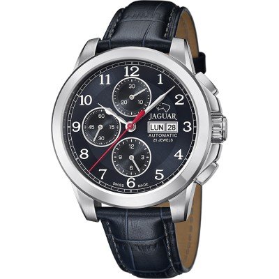 Seit der Gründung im Jahr 1938 konzentriert sich Jaguar auf die hochpräzise Schweizer Uhrmacherkunst, um höchste Zuverlässigkeit und Genauigkeit zu erreichen. Diese J975 Acamar aus der Serie „Le Chronographe“ ist eine Automatikuhr mit einem Swiss Made Valjoux 7750-3H104 Uhrwerk, einem Kaliber, das sich über die Jahre durch bewährte Qualität und Präzision ausgezeichnet hat. Die Chronographenfunktion misst die verstrichene Zeit in Einheiten von 1 Sekunde für 12 Stunden, 30 Minuten und 60 Sekunden, wobei der verlängerte Minutenzeiger die Minutenskala „berührt”, um eine genaue Zeitanzeige zu gewährleisten. Ein entspiegeltes Saphirglas sorgt für eine außergewöhnliche Sichtbarkeit des Zifferblatts und Kratzfestigkeit. Es ist eine schöne und zuverlässige Uhr, die sicherlich Liebhaber klassischer Herrenuhren ansprechen wird!