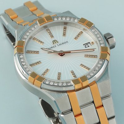 Diese Maurice Lacroix Uhr hat ein Edelstahl Gehäuse mit einem Durchmesser von 35 mm und ist mit einem Armband aus Edelstahl versehen. In der Uhr arbeitet ein Ronda Uhrwerk. Das Glas der Uhr besteht aus Doppel antireflex Saphirglas - Glas.