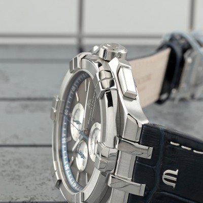 Diese Maurice Lacroix Uhr hat ein Edelstahl Gehäuse mit einem Durchmesser von 44 mm und ist mit einem Armband aus Leder versehen. In der Uhr arbeitet ein Ronda Uhrwerk. Das Glas der Uhr besteht aus Sapphir - Glas.