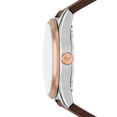 This Emporio Armani watch has a case made of stainless steel with a diameter of 43 mm and is fitted with a leather band. Inside the case lies a Miyota movement and the watch features a Mineral crystal.