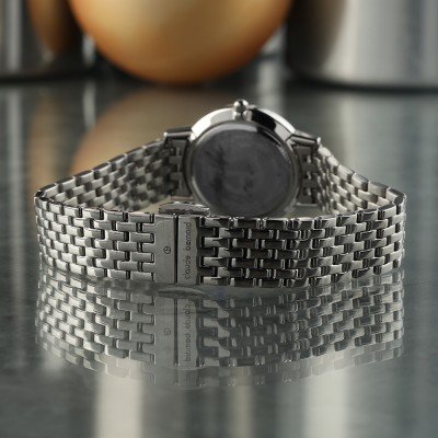 Este reloj marca Claude Bernard tiene una caja de Inox con un diámetro de 27 mm y cuenta con una correa de Inox. Dentro de la caja se encuentra un mecanismo de Ronda de alta calidad el cual esta protegido por un cristal Mineral.
