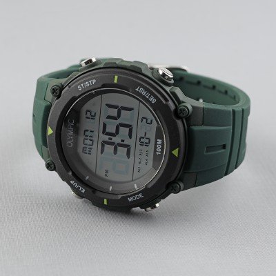 Este reloj marca Olympic tiene una caja de Resina con un diámetro de 46 mm y cuenta con una correa de Goma. Dentro de la caja se encuentra un mecanismo de CN de alta calidad el cual esta protegido por un cristal Mineral.