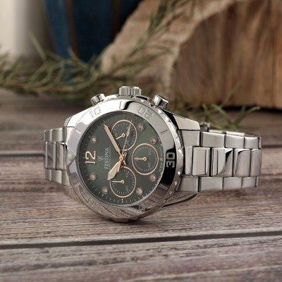 This Festina watch has a case made of stainless steel with a diameter of 39 mm and is fitted with a stainless steel band. Inside the case lies a Miyota movement and the watch features a Mineral crystal.