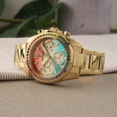 This Festina watch has a case made of stainless steel with a diameter of 38 mm and is fitted with a stainless steel band. Inside the case lies a Miyota movement and the watch features a Mineral crystal.