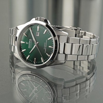This Festina watch has a case made of stainless steel with a diameter of 41 mm and is fitted with a stainless steel band. Inside the case lies a Ronda movement and the watch features a Mineral crystal.