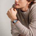 This Fossil watch has a case made of stainless steel with a diameter of 30 mm and is fitted with a leather band. Inside the case lies a Miyota movement and the watch features a Mineral crystal.