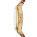 This Fossil watch has a case made of stainless steel with a diameter of 38 mm and is fitted with a leather band. Inside the case lies a Miyota movement and the watch features a Mineral crystal.