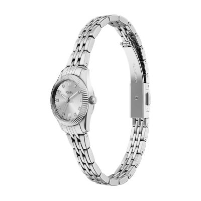 This Fossil watch has a case made of stainless steel with a diameter of 20 mm and is fitted with a stainless steel band. Inside the case lies a Seiko Instruments Inc. movement and the watch features a Mineral crystal.