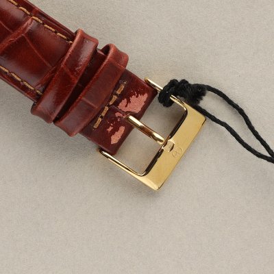 Montre retournée présentant de petites rayures au dos et des dommages sur le dessus du bracelet en cuir (au niveau de la boucle).
