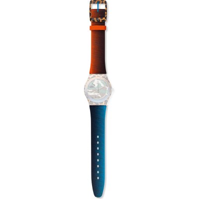 Ce bracelet de montre Swatchest fait de textile sur Cuir et est attaché à la montre au moyen de goupilles en acier. Le bracelet a une taille de 17 mm et se ferme au moyen d'un boucle. Le bracelet n'a pas de support droit, ce qui signifie que ce bracelet convient uniquement aux montres énumérées ci-dessous.