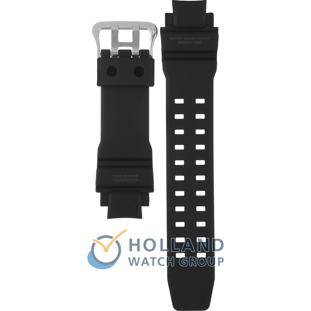 This G-Shock watch strap is made of plastic/Resin and is attached to the watch by means of pushpins. The band has a width of 26.5 mm and is closed by means of a buckle. The strap has no straight mount which means that this strap is only suitable for the watches listed below.