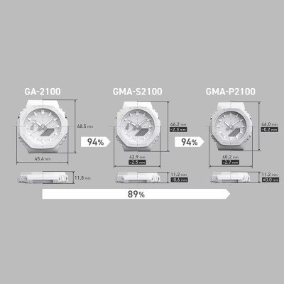 Minimalist and compact GMA-P2100 timepieces join the GA-2100 and GMA-S2100 in the 2100 line of octagonal watches in varying sizes. The GMA-P2100 watches now feature a minimalist design without the inset dial the others had, employing monochromatic finishes in vibrant colours to lift the spirit. Individual components are finished in different shades and textures for a more intricate feel.