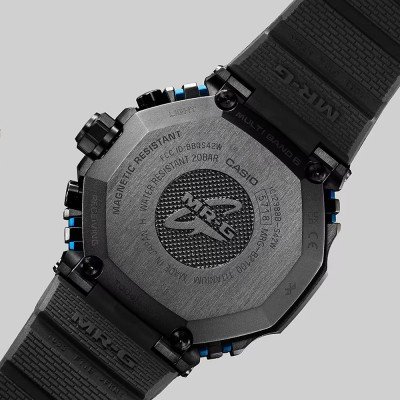 Like the MRG-B2100B-1ADR, previously released in 2024, the dial of the MRG-B2100R-2ADR is inspired by the traditional Japanese wood-joining technique ‘kigumi’. This is visible in the two-part structure of the indexes and the grid on the dial. Openings in the dial allow light to fall on the solar panels underneath, which provide the watch with energy. The MRG-B2100R is further inspired by Japanese ink painting and calligraphy, with a deep blue ao-zumi ink. The dial is deep blue, due to vapour deposition treatment, which is accentuated by a gold second hand. The bezel components on the four corners are ionized in navy blue, with a base of black diamond-like carbon coating. Naturally, the watch meets all the specifications you would expect from an MR-G: Ti64 titanium case, solar, radio control, Bluetooth and extensive functionalities.