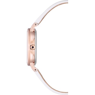 beautiful colour case and bright white strap which fits a very small wrist. Nice and light to wear. You hardly know its there when you are wearing it. Great watch and very good value for the price that was paid.