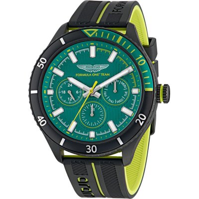 Questo orologio Aston Martin ha una cassa in Resina con un diametro di 46 mm ed è dotato di un cinturino in gomma. All'interno della cassa si trova un movimento di Timex e l'orologio è dotato di un cristallo di Minerale.