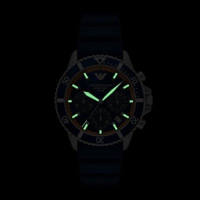 Questo orologio Emporio Armani ha una cassa in Inox con un diametro di 43 mm ed è dotato di un cinturino in gomma. All'interno della cassa si trova un movimento di Seiko e l'orologio è dotato di un cristallo di Minerale.