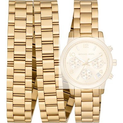 Questo cinturino Michael Kors è fatto in acciaio inox ed è collegato all'orologio per mezzo di perni a molla. Il cinturino ha una larghezza di 16 mm e si chiude a mezzo di chiusura a gioiello. Il cinturino non ha montatura dritta, il che significa che questo cinturino è adatto solo per gli orologi elencati di seguito.