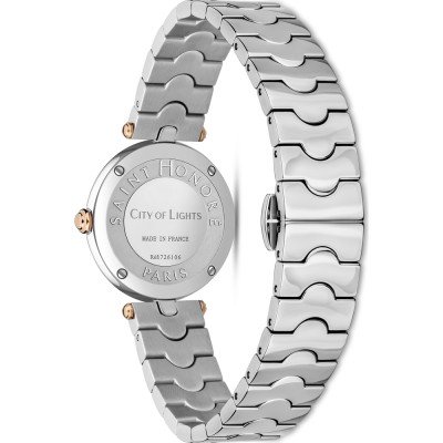Questo orologio Saint Honoré ha una cassa in Inox con un diametro di 28 mm ed è dotato di un cinturino in Inox. All'interno della cassa si trova un movimento di Ronda e l'orologio è dotato di un cristallo di Minerale.