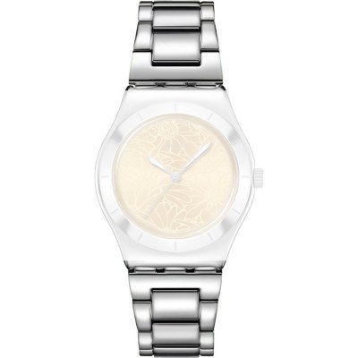 Questo cinturino Swatch è fatto in acciaio inox ed è collegato all'orologio per mezzo di perni in acciaio. Il cinturino ha una larghezza di 17 mm e si chiude a mezzo di chiusura a farfalla con bottoni. Il cinturino non ha montatura dritta, il che significa che questo cinturino è adatto solo per gli orologi elencati di seguito.