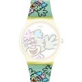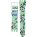 Questo cinturino Swatch è fatto in silicone ed è collegato all'orologio per mezzo di perni in acciaio. Il cinturino ha una larghezza di 19.7 mm e si chiude a mezzo di fibbia. Il cinturino non ha montatura dritta, il che significa che questo cinturino è adatto solo per gli orologi elencati di seguito.