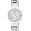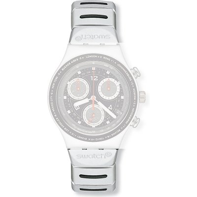 Questo cinturino Swatch è fatto in alluminio ed è collegato all'orologio per mezzo di perni in acciaio. Il cinturino ha una larghezza di 19.7 mm e si chiude a mezzo di chiusura deployante. Il cinturino non ha montatura dritta, il che significa che questo cinturino è adatto solo per gli orologi elencati di seguito.