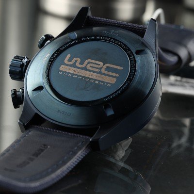 Questo cronografo in edizione speciale è realizzato nei colori blu e arancione del Campionato mondiale di rally e presenta il logo WRC sul fondello.