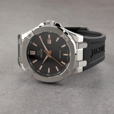 This Jaguar watch has a case made of stainless steel with a diameter of 44 mm and is fitted with a rubber band. Inside the case lies a Ronda movement and the watch features a Sapphire crystal.