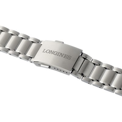 This Longines watch strap is made of titanium and is attached to the watch by means of quick release pushpins. The band has a width of 22 mm and is closed by means of a deployment clasp with push buttons. The strap has no straight mount which means that this strap is only suitable for the watches listed below.