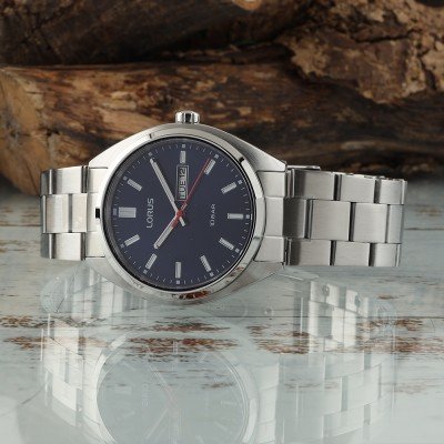 This Lorus watch has a case made of stainless steel with a diameter of 41 mm and is fitted with a stainless steel band. Inside the case lies a Seiko movement and the watch features a Hardlex crystal crystal.