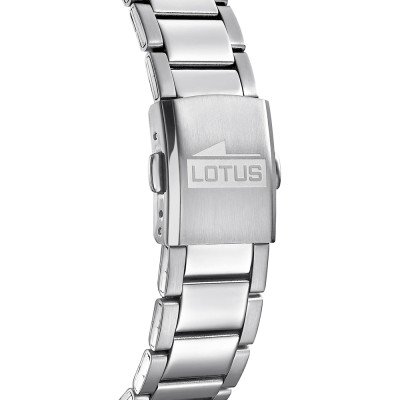 This Lotus watch has a case made of stainless steel with a diameter of 43 mm and is fitted with a stainless steel band. Inside the case lies a Miyota movement and the watch features a Mineral crystal.