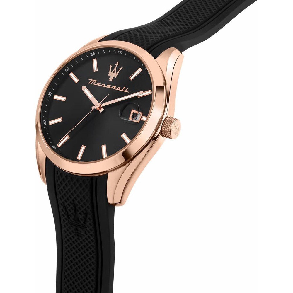 This Maserati watch has a case made of stainless steel with a diameter of 43 mm and is fitted with a rubber band. Inside the case lies a Miyota movement and the watch features a Mineral crystal.