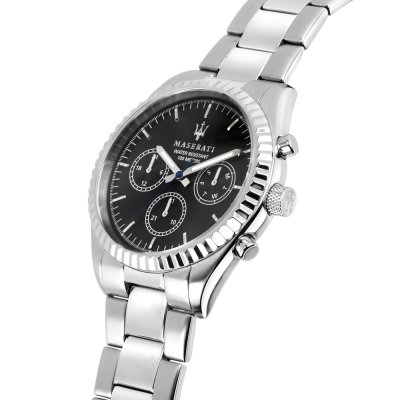 This Maserati watch has a case made of stainless steel with a diameter of 43 mm and is fitted with a stainless steel band. Inside the case lies a Seiko Instruments Inc. movement and the watch features a Mineral crystal.