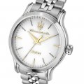 This Maserati watch has a case made of stainless steel with a diameter of 34 mm and is fitted with a stainless steel band.