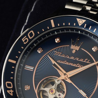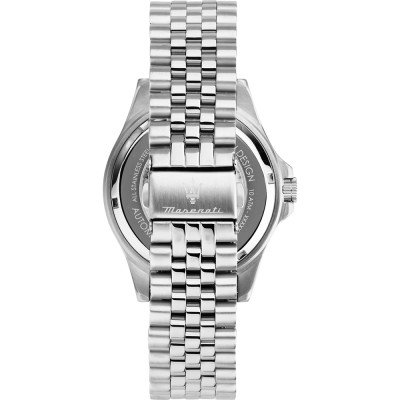 This Maserati watch has a case made of stainless steel with a diameter of 44 mm and is fitted with a stainless steel band. Inside the case lies a Seiko Instruments Inc. movement and the watch features a Sapphire crystal.