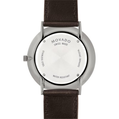 This Movado watch has a case made of stainless steel with a diameter of 40 mm and is fitted with a leather band. Inside the case lies a Ronda movement and the watch features a Sapphire crystal.