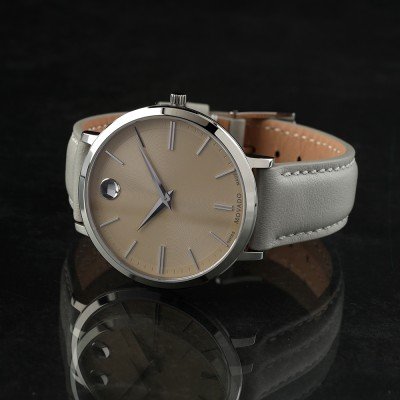 This Movado watch has a case made of stainless steel with a diameter of 35 mm and is fitted with a leather band. Inside the case lies a ETA movement and the watch features a Sapphire crystal.