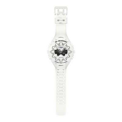 Soms denkt u misschien dat er niets meer te verbeteren valt aan horloges in de 21e eeuw, maar dan heeft u buiten G-Shock gerekend. Na veertig jaar van constante innovatie is het merk er opnieuw in geslaagd om de horlogewereld te verrassen met een volledig uniek en origineel ontwerp. Met een compleet nieuwe benadering van de constructie heeft de GA-V01 niet alleen een spectaculair uiterlijk, maar is het ook super schokbestendig en verbergt opmerkelijke technische innovaties: De kaststructuur, die het uurwerk beschermt, maakt gebruik van een geïntegreerde bezel- en armbandconstructie die het glas gedeeltelijk overlapt en zo ook als bumper fungeert om schokken op te vangen. Casio heeft ook een nieuwe magnetische wijzerconstructie ontwikkeld, waarbij de wijzers, die normaal gesproken kwetsbaar zijn voor schokken, niet aan de as zijn bevestigd, maar op hun plaats worden gehouden door magnetische kracht. Hierdoor kunnen ze schokken effectief absorberen en afvoeren. Deze nieuwe technologie maakt het ook mogelijk om grotere, uniek gevormde wijzers te maken omdat de as hun gewicht niet hoeft te dragen. Na een schok of trilling kunnen de wijzers tijdelijk uit positie verschuiven, maar binnen een paar minuten keren ze op bijna magische wijze terug naar hun oorspronkelijke positie. De analoog-digitale wijzerplaat heeft een gelaagde constructie met een metalen wijzerplaat met rastergedeeltes, die een decoratieve blik in het interieur werpen, en een LCD-display. Dit horloge is niet voor degenen die risico's mijden. Het is opvallend, groot en zal mensen zeker aan het praten krijgen! En, u bent verzekerd van een sterk en krachtig uurwerk dat blijft werken, ongeacht schokken en stoten!