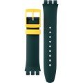 Dit Swatch horlogebandje is gemaakt van bio-plastic en wordt aan het horloge bevestigd door middel van stalen pennen. De band heeft een breedte van 19.7 mm en wordt gesloten door middel van een gesp. De band heeft geen rechte aanzet wat betekent dat deze band alleen geschikt is voor de horloges die hieronder worden vermeld.
