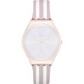 Dit Swatch horlogebandje is gemaakt van siliconen en wordt aan het horloge bevestigd door middel van stalen pennen. De band heeft een breedte van 15.9 mm en wordt gesloten door middel van een gesp. De band heeft geen rechte aanzet wat betekent dat deze band alleen geschikt is voor de horloges die hieronder worden vermeld.