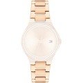 Dit Tommy Hilfiger horlogebandje is gemaakt van roestvrij staal en wordt aan het horloge bevestigd door middel van bandpennen. De band heeft een breedte van 20 mm en wordt gesloten door middel van een vouwsluiting met drukknoppen. De band heeft geen rechte aanzet wat betekent dat deze band alleen geschikt is voor de horloges die hieronder worden vermeld.